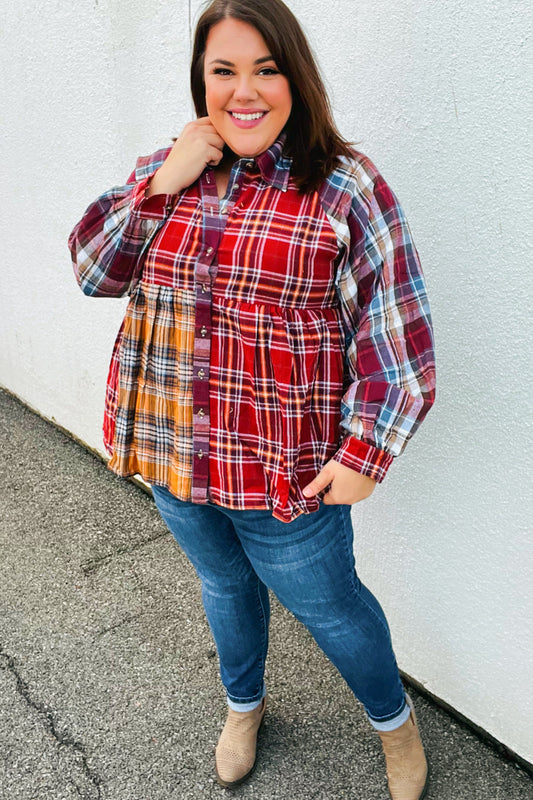 Terracotta & Mustard Plaid Color Block Babydoll Top