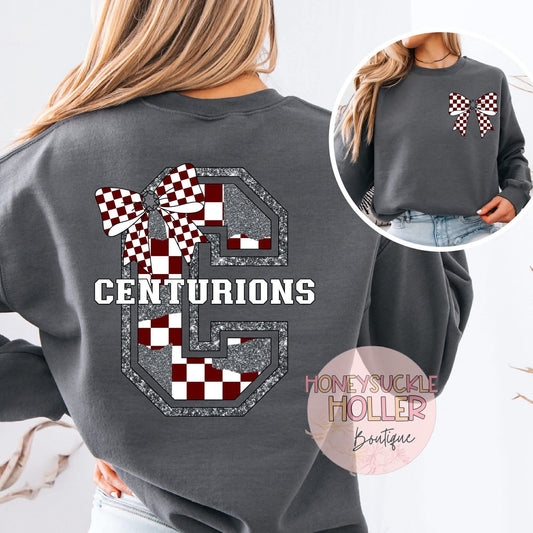 Maroon and Gray Checkered Bow With Bow Front & Back Design Varsity Letter - C Centurions